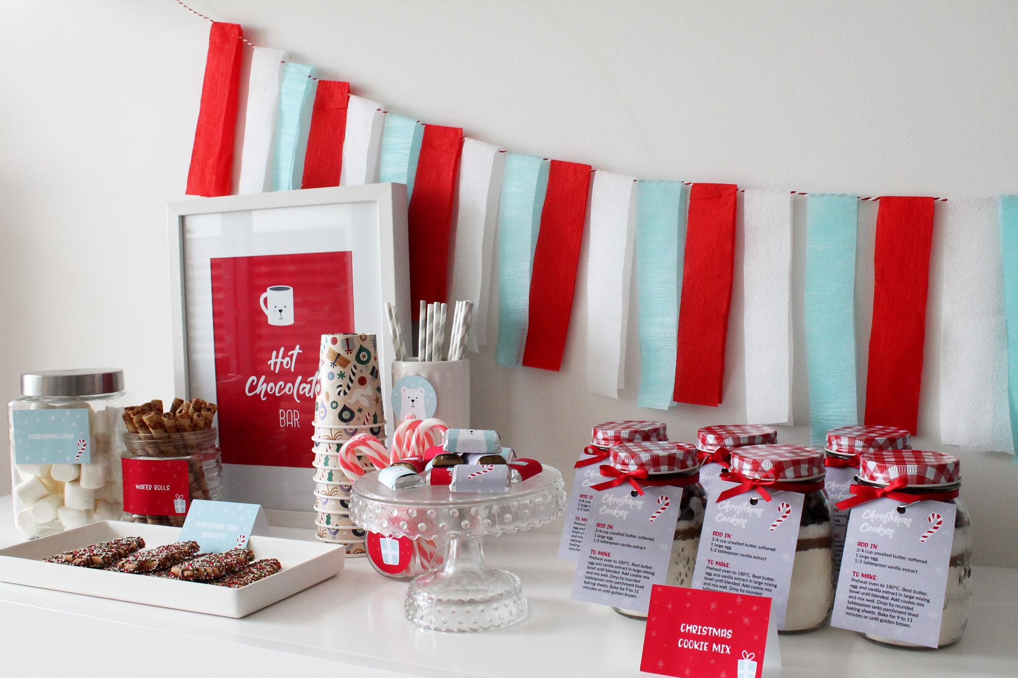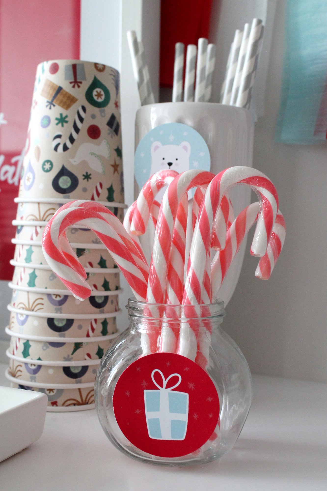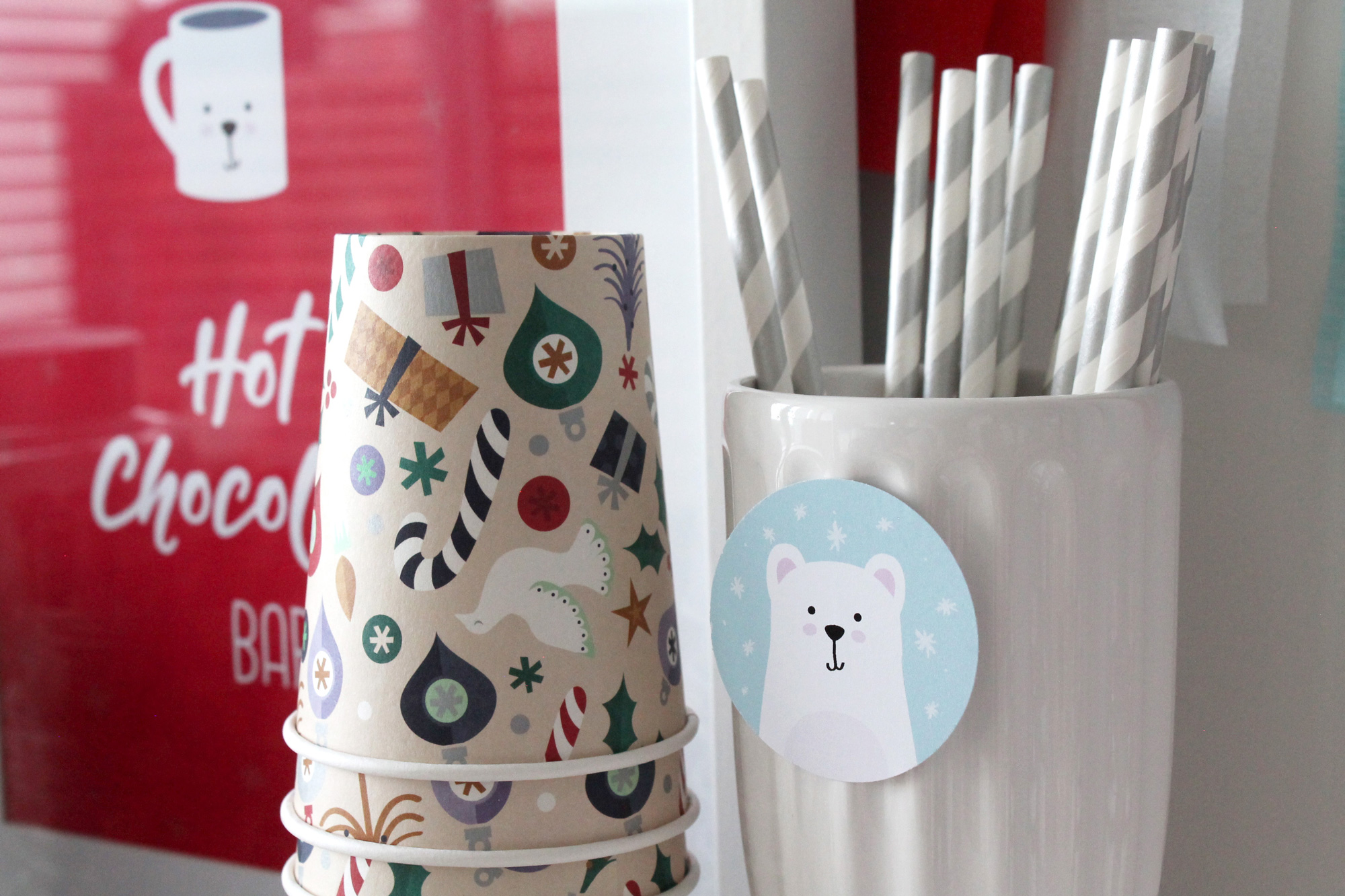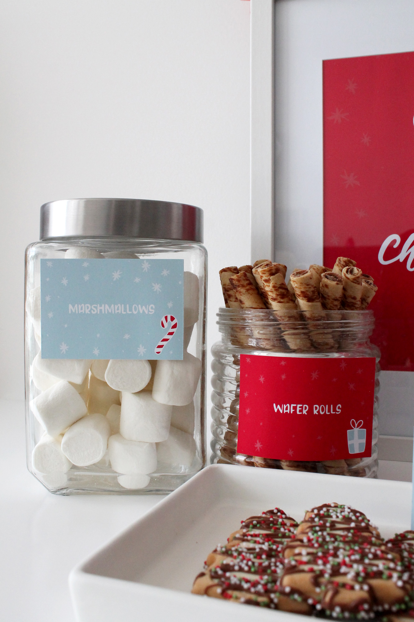 I started by printing and framing the Hot Chocolate Bar Sign. I then filled glass jars with marshmallows, wafer rolls and candy canes. Some cute paper cups and straws and the hot chocolate station was all set.