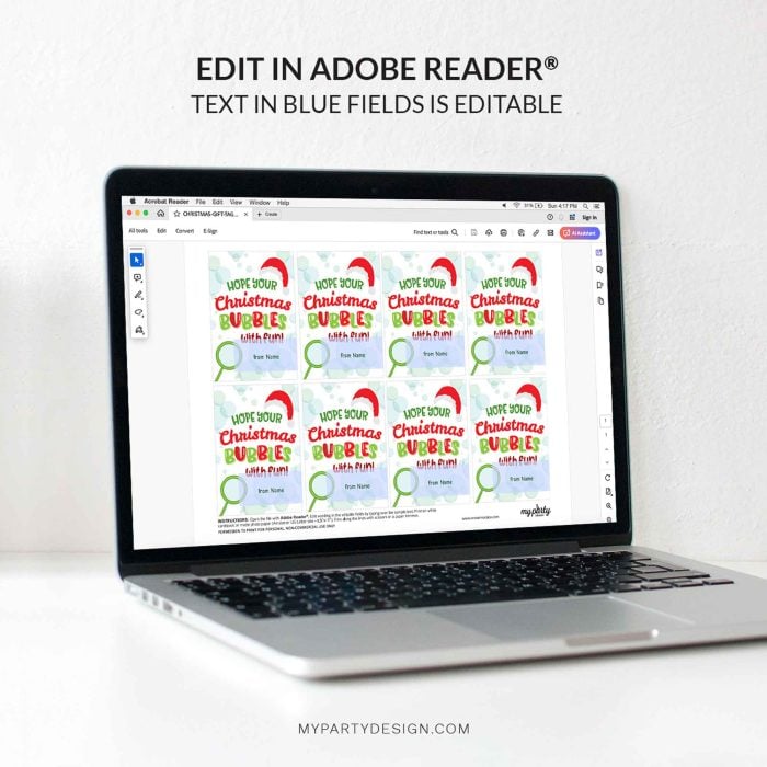 Make easy Christmas gifts for teacher, students or classmates this Christmas with this printable Christmas Bubbles with Fun Gift Tag! Pair with a bubble wand for a thoughtful Christmas gift kids will love. Suitable for school teachers, preschool or daycare educators gifts for students, PTA PTO volunteers, co-workers, staff, family friends, clients, neighbors or class gifts. With editable text, you can personalize it with a name or custom message.