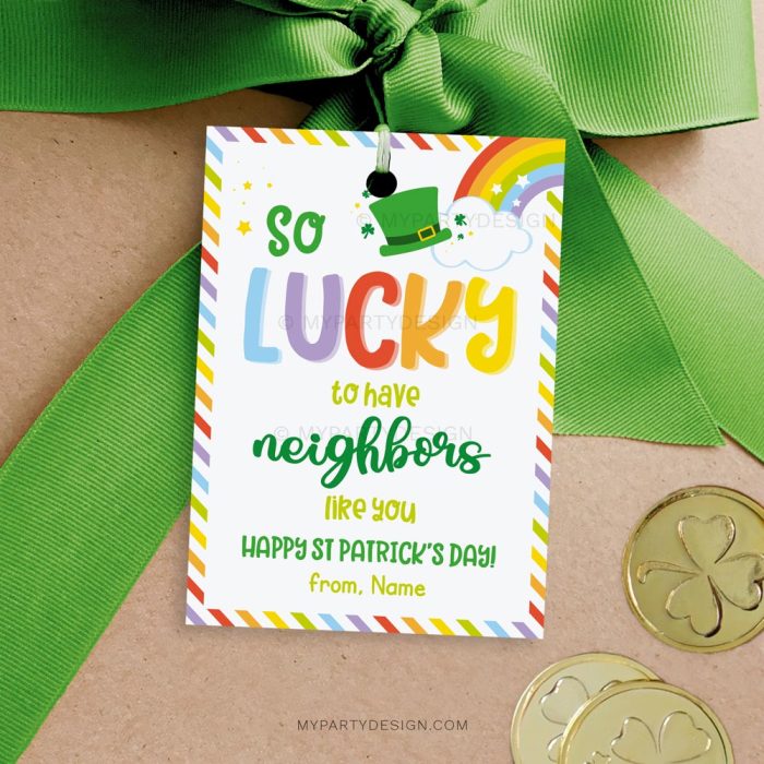 • St Patrick’s Day Tags / Cards; size 2,5” x 3,5” (≈ 6,5cm x 9cm); Wording “So lucky to have neighbors like you. Happy St Patrick’s Day” (US and UK/AU spelling included)